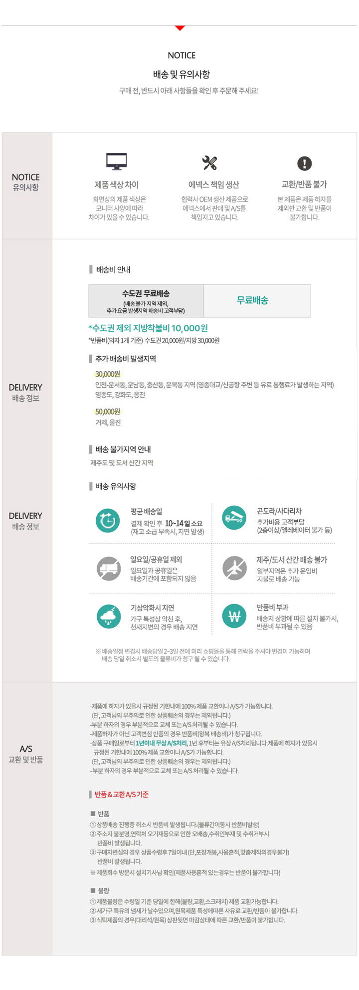 | 배송·설치비용 | 수도권 무료배송(배송불가지역제외,추가요금발생지역 배송비 고객부담), 지방착불비 10,000 | 품질보증기준 | ○ 제품 하자 시 규정된 기한 내에 제품 교환 및 A/S가능(단, 고객님의 부주의로 인한 상품훼손의 경우는 제외)○ 상품 구매일로부터 1년 무상 A/S, 1년 이후 유상 A/S |