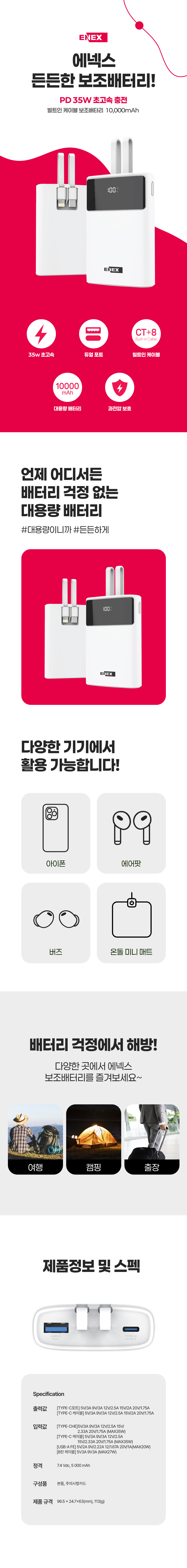 | 품명 및 모델명 | 에넥스 PD 35W 초고속 충전 빌트인 케이블 보조배터리 (10,000mAh) | ||